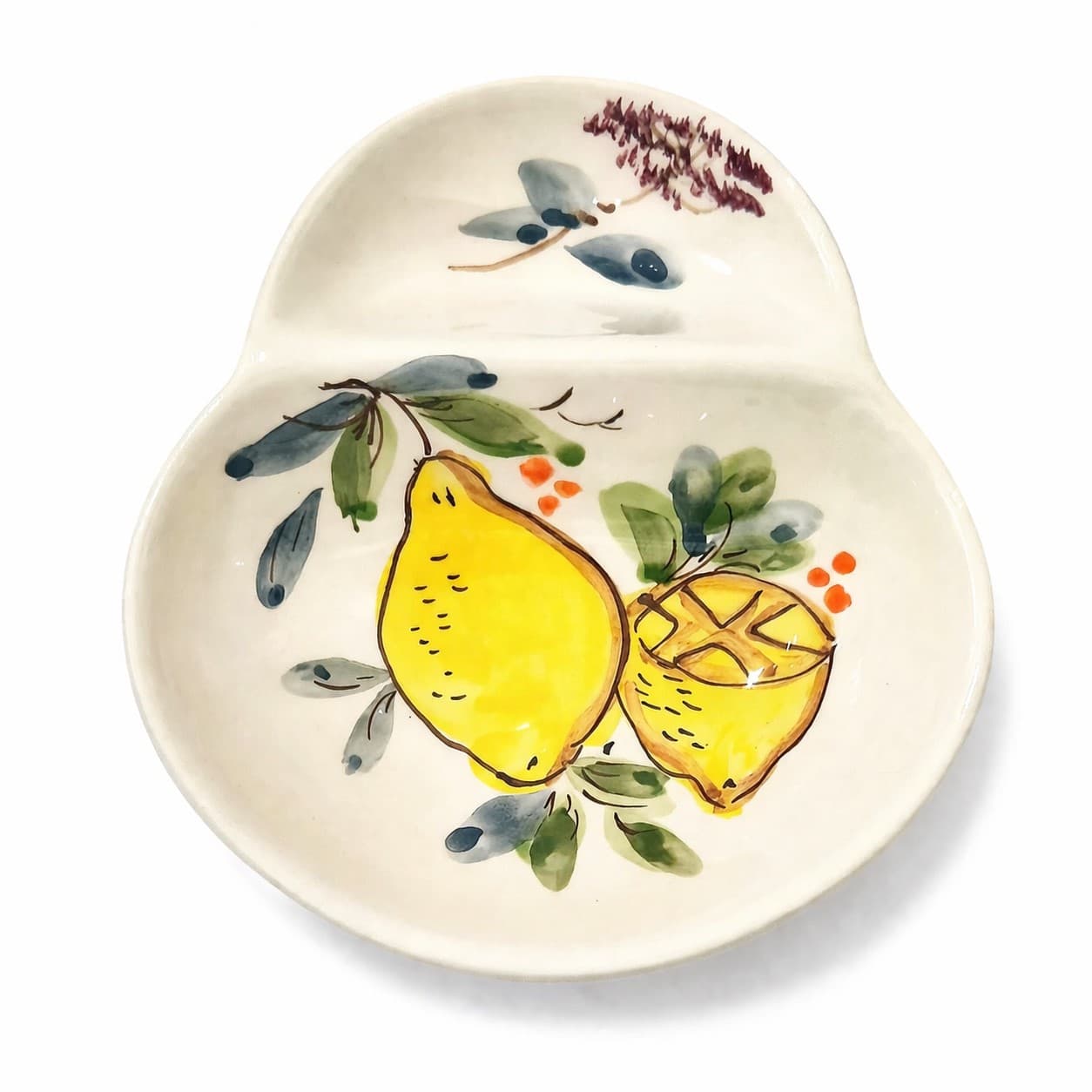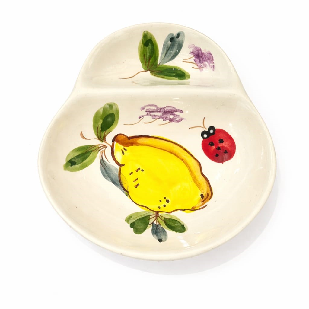 Azeitoneira redonda em cerâmica pintada à mão diversos desenhos de limões, feita e pintada em Portugal.