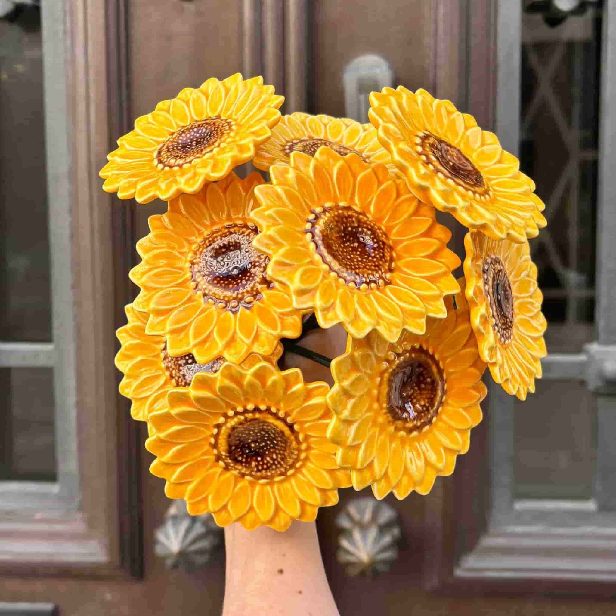 Flores em cerâmica feitas á mão com características próprias e cores vibrantes.